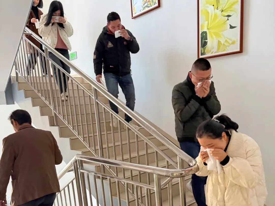 理論授課結束后,一場無預告的實戰演練隨即拉開帷幕。隨著尖銳的警報聲突然響起,演練正式啟動。集團副總經理黃曉斌擔任此次演練的總指揮,迅速統籌協調各項工作。在疏散引導員的有序指揮下,全體員工保持冷靜,用濕毛巾或衣物掩住口鼻,采取彎腰低姿的正確姿勢,沿著預定疏散路線快速、有序地向室外安全區域撤離。整個疏散過程緊張而有序,最終僅用 3 分鐘便完成了全員安全撤離,充分檢驗了集團應急疏散預案的科學性與可操作性,也展現了員工們良好的應急反應能力與協作精神。